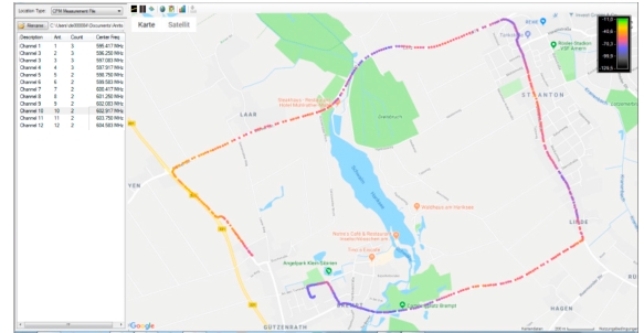Each time you select a frequency, the corresponding trace will appear and the Breadcrumb Map will display the coverage mapping results in different colors as shown in Figure: Mapped Measurement Results. The corresponding power levels are given on the right side of the map.