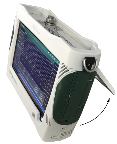 The attached tilt bail can be used for desktop operation. The tilt bail provides a backward tilt for improved stability and air flow. To deploy the tilt bail, pull the bottom of the tilt bail away from the back of the instrument. To store the tilt bail, push the bottom of the bail towards the back of the instrument and snap the bail into the clips on the back of the instrument.