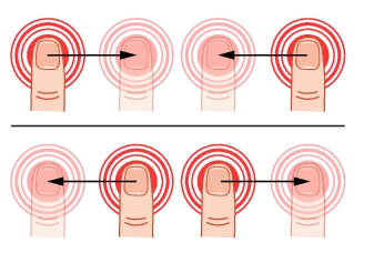 ![]() | Pinch: Some items can be reduced or expanded. This action is accomplished by simultaneously pressing the item with two fingers and holding the item lightly when dragging the fingers in closer together or out farther apart, and then releasing. You can pinch items in or out, such as the frequency span by touching and holding the trace in two positions, and then dragging your fingers closer together to narrow the span or dragging your fingers farther apart to widen the span. |