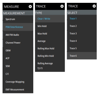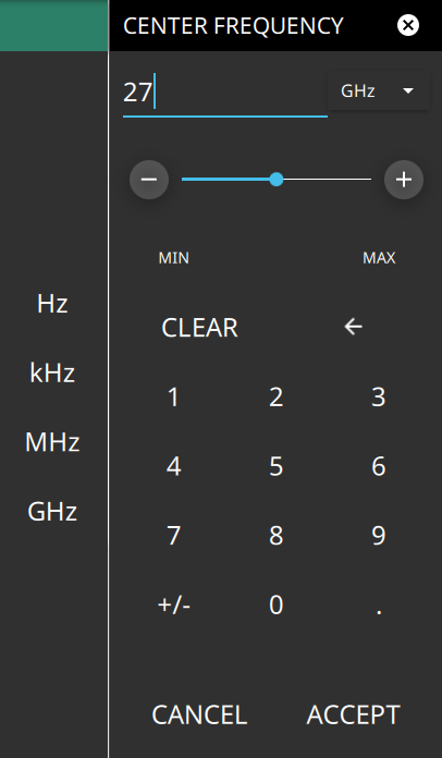 ![]() | The keypad typically provides controls to: • Enter new values directly, such as frequency entries in Hz, kHz, MHz, or GHz. There are two places on the keypad to enter unit terminators when applicable, on left side pop-out that occurs as frequency keypad entries are selected, or on the top right corner drop-down of the entry field. • Drag a parameter value within its settable range using a sliding control. • Increment the parameter value up or down. At each end of the slider are plus (+) and minus (–) controls that increment the parameter value. Most parameters have a fixed increment, such as bandwidth that follows a 1:3:10 sequence and span that follows a 1:2:5:10 sequence. In the case of frequency, you can set a custom frequency step increment value. Once the entry is complete, select the desired unit or select ACCEPT to complete the entry. • Set the parameter to the maximum or minimum possible value. • CLEAR the entire entry. • Left arrow to backspace and delete the entry • CANCEL to terminate any entries made for that particular setting. Note that selecting the "X" to close the keypad is the same as selecting cancel. Selecting CANCEL will restore settings back to the state they were in before the keypad opened, even if changes from the +/- controls are already reflected in the data display. • ACCEPT to operate with the settings displayed on the keypad. |