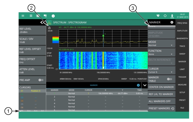 1. The title bar provides quick access to system settings, measurement mode selection, informational dialogs, and screen capture. 2. The status and trace panel is used to show common settings and controls, and to provide trace and cursor information. The information displayed on this panel depends on the current measurement and view settings. Refer to the appropriate chapter in this guide for information about this panel. 3. Menus are used to configure measurement settings such as frequency, amplitude, and bandwidth, and to enable measurement modes and views such as Spectrogram view, OBW, ACP, and SEM measurements. 4. The main menu provides access to setting menus and other instrument controls. 5. The upper area typically displays graphical data such as spectrum trace and spectrogram plots. The lower area typically displays tabular measurement data such as marker data, demodulation results, or other measurement data depending on the selected measurement. |