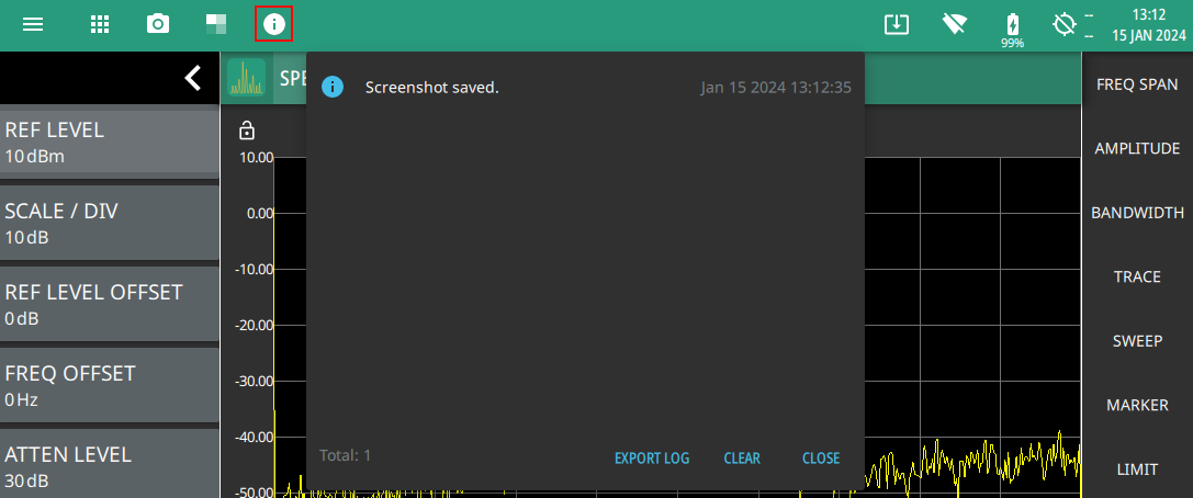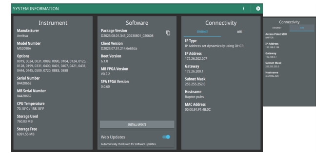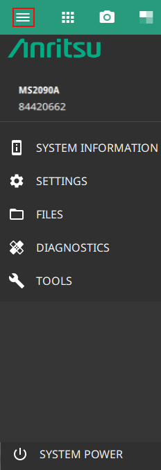 - | The System menu displays the instrument model and serial number. It consists of following menus: SYSTEM INFORMATION Opens the System Information Menu. Select SYSTEM INFORMATION menu to view instrument, software, and connectivity details. SETTINGS Opens the Settings Menu. Select SETTINGS menu to access all system level settings and controls. FILES Opens FILES (File Management). Select FILES menu to open File Management screen. In file management screen you can manage the internal files or files saved on a USB memory device. DIAGNOSTICS Opens Diagnostics Menu. Select DIAGNOSTICS menu to view battery information, self test results, service mode and event log screens. TOOLS Opens Tools Menu.Select TOOLS menu to concatenate IQ streaming metadata files, get connected to the web, access Map Tool and access PDF reporting. SYSTEM POWER Select SYSTEM POWER menu to either RESTART or POWER OFF the instrument. |