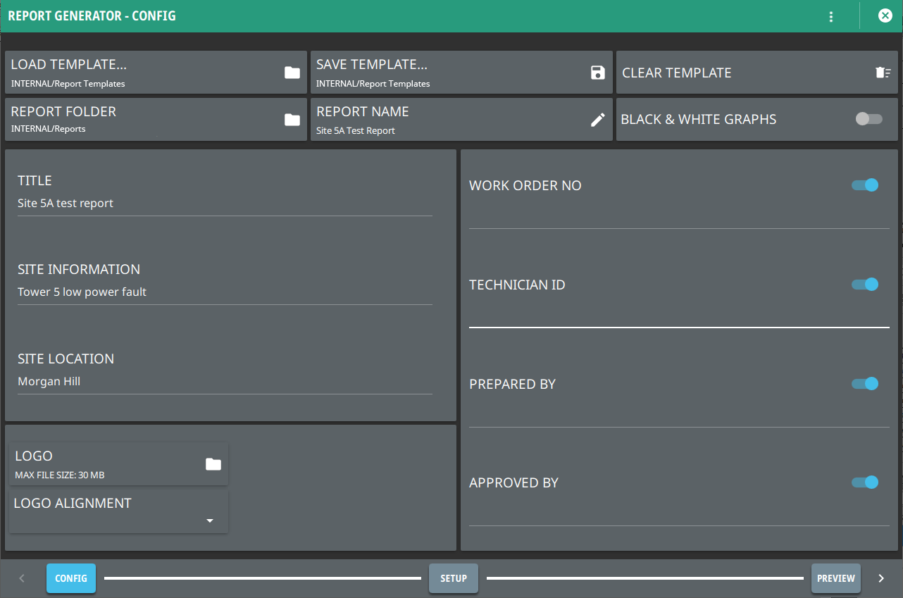 2. In REPORT GENERATOR – CONFIG window you can load a template to populate the given fields.