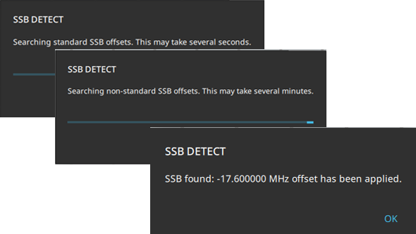 - ![]() | BAND CONFIG Opens the BAND CONFIG Menu. CENTER FREQUENCY Sets the center frequency of the measurement channel. Changing the center frequency sets the band to MANUAL. SPAN Sets the sweep frequency range. Pressing the plus (+) or minus (–) control increments the span value in a 1:2:5 sequence. The span can also be changed by pinching the trace in or out when gestures are not toggled off. CHANNEL BW Sets the measurement channel bandwidth. The available bandwidth settings depend on the selected band and bandwidth option installed in the instrument. Refer to “Options Settings” section in Instrument Overview chapter of the user guide. SSB FREQUENCY Sets the absolute SSB frequency. SSB OFFSET SSB is the synchronous signal block. The SSB offset sets the frequency offset between the SSB and the center frequency of the channel. Negative values result in an offset lower than the center frequency. Positive values result in an offset higher than the center frequency. AUTO DETECT SSB Auto detects the center position of the SSB according to the 3GPP raster of GSCN values. If the search is successful, the correct SSB OFFSET is automatically applied and the signal should synchronize for demodulation. See Figure: AUTO DETECT SSB Dialogs (5GNR Measurements). SUBCARRIER SPACING Sets the subcarrier spacing. The available input range is dependent on the selected band. MAPPING PATTERN Select which mapping pattern: P1 for the 3GPP Phase 1 standard, March 2018. P2 for the 3GPP Phase 2 standard, September 2018. Auto selects the most recent standard. GESTURES Opens the GESTURES Menu. Not available in 5GNR Summary, OTA (Multi PCI), Carrier Aggregation and Constellation measurements. |