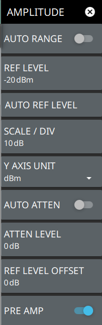 - ![]() | AUTO RANGE The instrument will dynamically update the attenuation and preamp settings for the measurement. Auto range helps ensure that harmonics and spurs are not introduced into the measurements. REF LEVEL The reference level is the top graticule line on the measurement display. If the reference level offset is not zero, the offset reference level is displayed at this menu location. If auto range is enabled, the reference level is graphical only and will have no impact on attenuation or preamp. AUTO REF LEVEL Auto reference level will change the reference value so as to place the highest signal amplitude at about two graticule lines from the top. This feature is not available when auto range is enabled. SCALE/DIV The scale can be set from 1 dB per division to 15 dB per division. The default setting is 10 dB. Y AXIS UNIT Selects the y-axis amplitude units of dBm, dBW, dBV, dBmV, dBµV and dBA. AUTO ATTEN Input attenuation can be either tied to the reference level (on) or manually selected (off). When input attenuation is tied to the reference level, attenuation is increased as higher reference levels are selected to make sure the instrument input circuits are not saturated by large signals that are likely to be present when high reference levels are required. Auto attenuation is not available when auto range is enabled. ATTEN LEVEL Manually sets the attenuation level. This feature is not available when auto range or auto attenuation is enabled. REF LEVEL OFFSET Reference level offset compensates for the presence of external input attenuation or gain. The default offset value is 0 dB. The reference level on the Y-axis will reflect the new offset value. For example, if the reference level was 0 dBm and an offset value of –10 dB is applied, the offset reference level will be 10 dBm. PRE AMP Turns the low-noise front-end preamplifier on or off. To ensure accurate measurement results, the largest signal into the instrument input when the preamplifier is turned on should be less than –40 dBm. The preamplifier cannot be turned on if auto attenuation is on and reference level is above –40 dBm. |