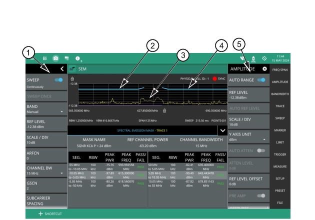 1. The status panel provides quick access to common spectrum analyzer settings. See STATUS PANEL (5GNR SEM). 2. SEM Mask 3. Spectrum Emission 4. SEM Mask 5. All SEM measurements parameters are set using setup menu. See SETUP Menu (5GNR SEM). |
