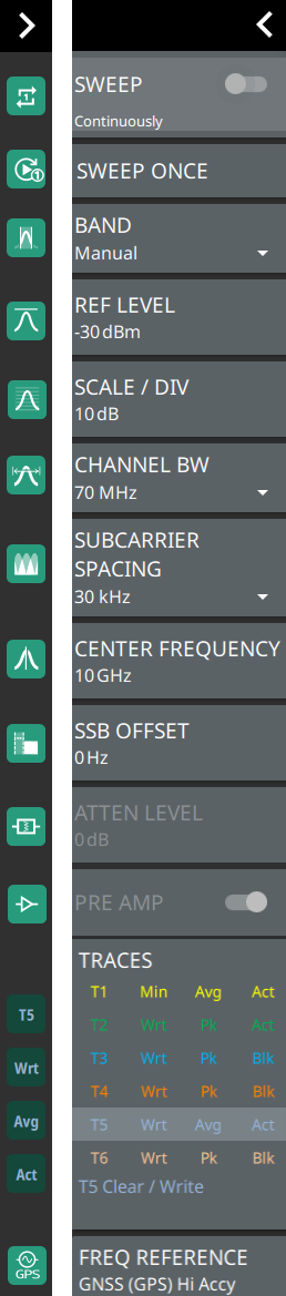 ![]() | SWEEP Toggles the current sweep setting between continuously or sweep once. Refer to Setting Sweep Parameters. SWEEP ONCE When sweep is set to single sweep, SWEEP ONCE updates the measurement display. Data continues to be captured in the background. BAND Select MANUAL, GLOBAL ALL or one of the predefined bands. Selecting MANUAL hides ARFCN and GSCN settings. Selecting a predefined band or GLOBAL ALL activates ARFCN and GSCN settings. REF LEVEL Sets the reference level of the top graticule line in the selected units. If the reference level offset is not zero, OFFSET REF LEVEL is displayed at this location. Refer to Setting Amplitude Parameters. SCALE/DIV Sets the graticule scale/division for log-based units. This setting does not apply to linear units. CHANNEL BW Sets the measurement channel bandwidth. The available bandwidth settings depend on the selected band and bandwidth option installed in the instrument. Refer to “Options Settings” section in Instrument Overview chapter of user guide. SUBCARRIER SPACING Sets the subcarrier spacing. The available input range is dependent on the selected band. CENTER FREQUENCY When the band is set to MANUAL, sets the center frequency of the measurement channel. Changing the center frequency sets the band to MANUAL. SSB OFFSET SSB is the Synchronous Signal Block. The SSB Offset sets the frequency offset between the SSB and the overall resource block. ATTEN LEVEL When auto attenuation is off, sets input attenuation. PRE AMP Toggles the low-noise front-end preamplifier on or off. Refer to Setting Amplitude Parameters. TRACES Displays the current status of up to six traces in the status panel. The trace card includes the trace number, type, mode, and detector type. The active trace will show a highlighted background with the mode and detector type restated under the table. Selecting a trace in the status panel activates the pressed trace and opens the TRACE menu, allowing you to select and set up an individual trace as desired. Refer to Setting Trace Parameters. FREQ REFERENCE Indicates the current frequency reference source of Internal High Accuracy (used after GPS has lost sync, but while the internal clock still has good GPS reference), Internal Standard Accuracy, External, or GNSS (GPS) Hi Accy (requires GPS). The instrument automatically selects the frequency reference in the following order of priority: external, GPS, then the internal time base. | |
