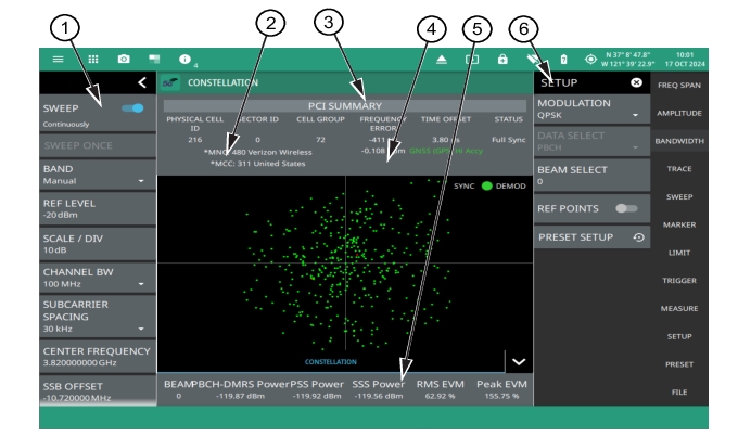 1. 5GNR Analyzer Status Panel: Each measurement features a unique status panel that displays settings and information relevant to the current measurement and view settings. This panel provides quick access to the measurement frequency, subcarrier spacing, channel bandwidth, and band configuration. See Status Panel (5GNR Constellation). 2. MNC/MCC Info: This area shows the Mobile Network Code (MNC) and Mobile Country Code (MCC) codes along with the carrier and the country name. Touch this info to open SIB MEASUREMENT dialog. Note that the asterisk symbol on this information indicates the presence of LAST SIB DECODE info as shown in Figure: 5GNR SIB MEASUREMENT and LAST SIB DECODE. Refer to SIB Measurement for detailed information. 3. PCI Summary: This area shows the physical cell ID summary data, including the sector ID, cell group number, frequency error, time offset, and sync status. Sync status can indicate if there is a PSS, SSS, or Beam Index failure, Full Sync, or an Unknown condition. Also noted is the instrument’s reference clock accuracy of Internal, External, or GNSS (GPS) high accuracy (requires GPS). 4. Constellation: This area displays the demodulated symbol point location on an IQ coordinate plot. Points are drawn in colors that are associated with the symbol point density. Warmer colors (red/orange) indicate a higher symbol density where cooler colors (cyan/blue) indicate lower symbol density. The ideal symbol reference point location overlay can be toggled on or off via the SETUP menu. 5. Channel Summary: For the currently selected beam, shows the RMS error vector magnitude (EVM), peak EVM (@ subcarrier/symbol) and received power in dBm for each block measurement: • Beam: Shows the value of the selected 5GNR SSB beam. • PBCH-DMRS Power: In 5GNR measurements, the PBCH decoding relies on a demodulation reference signal (DMRS, which is a physical layer reference signal used for decoding) rather than a cell specific reference signal (CRC). • PSS Power: The primary synchronization signal provides the primary frame boundary (i.e., the position of the first symbol in the frame). • SSS Power: Similar to PSS, the secondary synchronization signal provides the secondary sub-frame boundary. • RMS EVM: Shows the percentage value of all the error vectors between the reconstructed ideal signals and the received signals divided by the RMS value of the ideal signals. • Peak EVM: Shows the dominant cell’s peak EVM of all the error vectors between the reconstructed ideal signals and the received signals, divided by the RMS value of the ideal signals. 6. SETUP Menu: The constellation measurement settings are configured in the SETUP menu. See SETUP Menu (5GNR Constellation). |