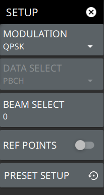 - ![]() | MODULATION Selects the modulation format (only QPSK is available). DATA SELECT Selects the data format (only Physical Broadcast Channel (PBCH) is available). BEAM SELECT: Selects the 5GNR SSB beam for the demodulation and display. Minimum beam is 0 and Maximum is 63 REF POINTS Toggles the ideal reference point locations on or off. PRESET SETUP Presets the SETUP menu to default settings. |