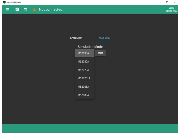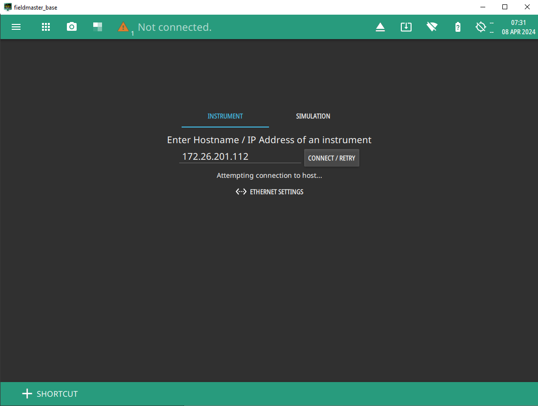 Connecting to a networked instrument or to the simulation mode is established via the system menu. If connecting to an instrument, the instrument must first be connected to the network via Ethernet or Wi-Fi and the hostname/ IP address of the instrument must be known.
