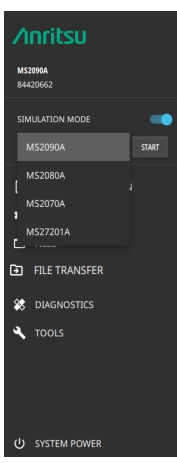 - ![]() | The System menu identifies the instrument model and serial number. HOSTNAME/IP ADDRESS Displayed only on the ARRT software. This field is used to enter the IP address or hostname of an instrument that is connected to the network. When SIMULATION MODE is toggled on, the software will connect locally to provide some UI functionality. Toggle the simulation mode and select the product from the drop-down and click START button to get connected with the local host. Click STOP button to get disconnected. Note that some of the system menus have limited functionality when the software is connected to the Simulation Mode. When connected to an instrument, refer to System Menu. SYSTEM INFORMATION Displays information about the instrument and software. Refer to System Information. SETTINGS Provides access to setting the display color theme and screenshot capture settings (refer to Display Settings). FILES Opens the Windows file explorer. Refer to FILES (File Management). FILE TRANSFER Opens the FILE TRANSFER. DIAGNOSTICS Opens Diagnostics Menu. TOOLS Opens the Tools Menu. SYSTEM POWER Opens a dialog to RESTART or POWER OFF the instrument. |