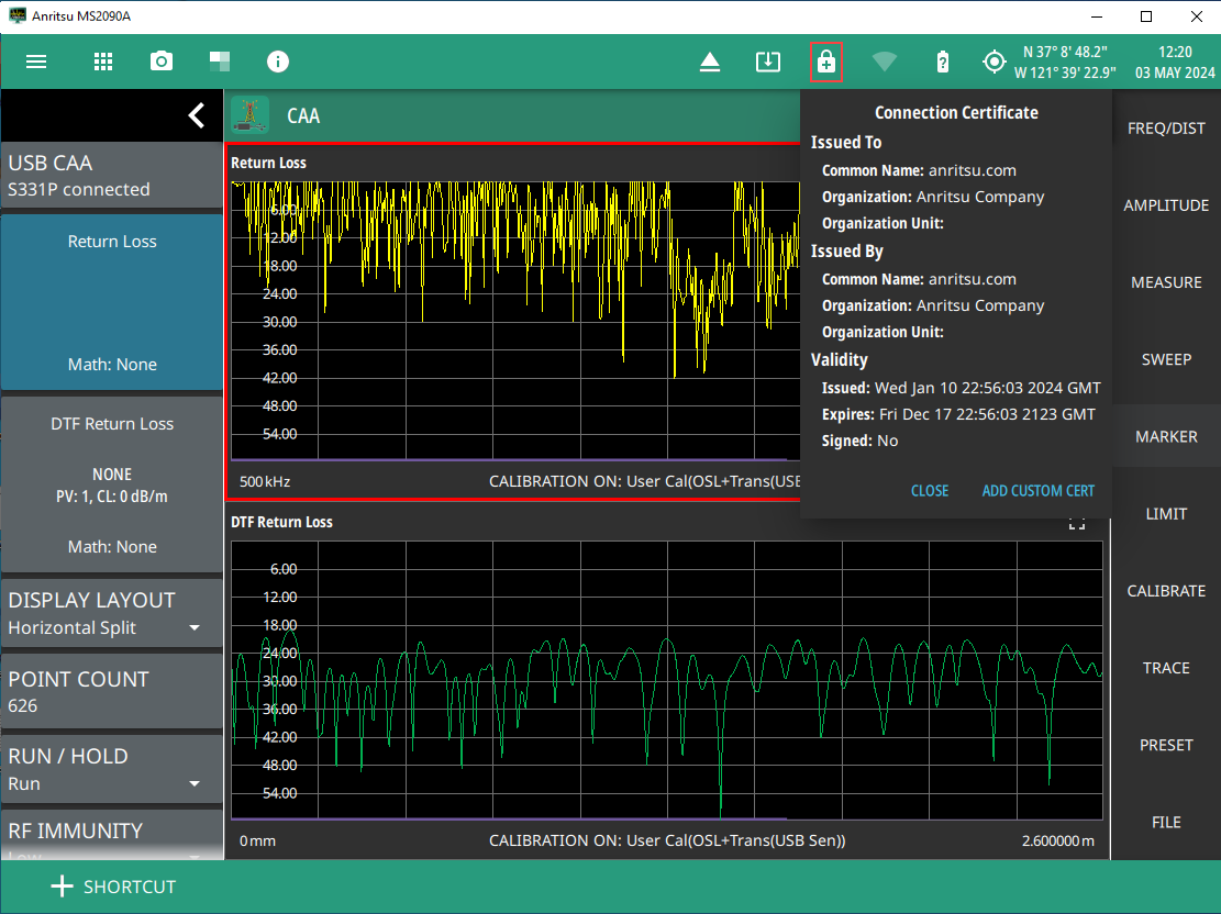 Note | The Connection Certificate icon is available only on Anritsu Remote Tool installed on the PC and not on the instrument. |
