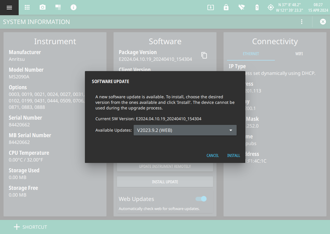 2. Select the latest available update from the Available Updates drop-down and press INSTALL.