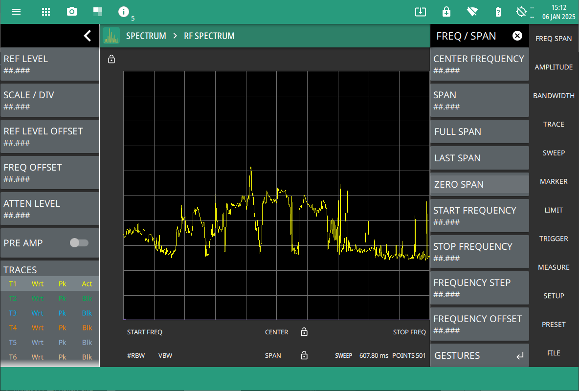 To enable instrument’s measurement data blanking go to System menu (3-line icon) > Settings > Advanced > Secure Display. Turn on the Secure Display toggle to hide the displayed frequency/amplitude/bandwidth values. Frequency values displayed on the screen and menus are replaced with ##.#### symbols as shown in Figure: Secure Display On - Frequency Blanking.