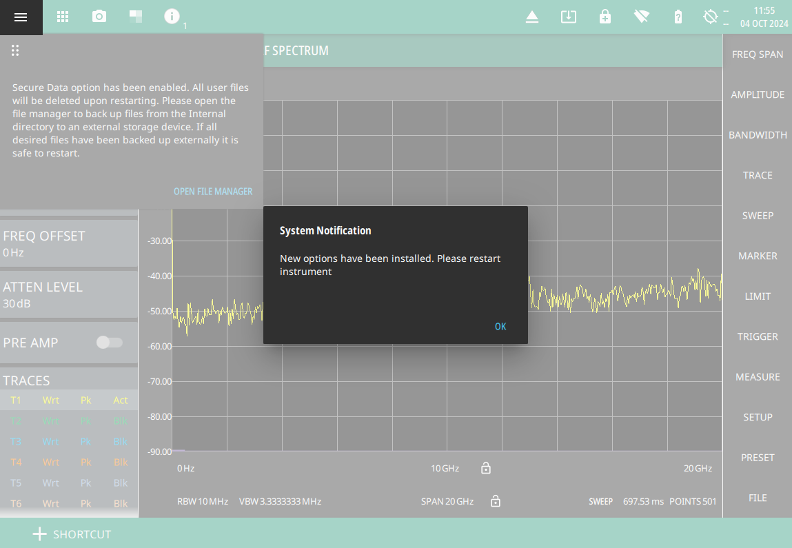 6. Go to System Menu > SYSTEM POWER > CONTINUE TO REBOOT> RESTART INSTRUMENT to finish rebooting the unit to complete enabling the Option 7.