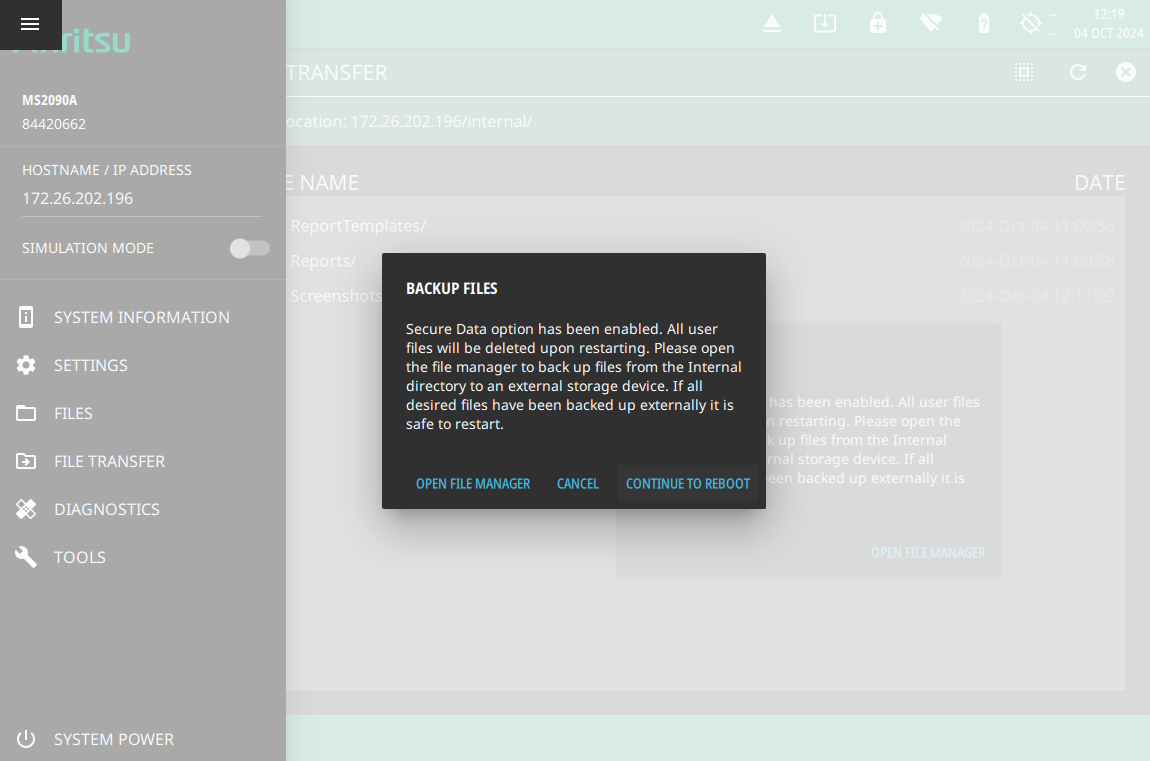 2. Touch OPEN FILE MANAGER to save the files stored in the instrument’s internal directory to an external USB memory device.