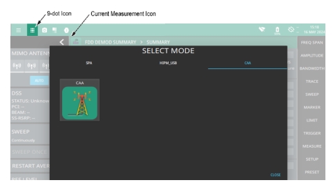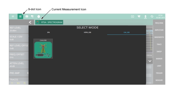 From the instrument’s title bar, either touch the 9-dot icon or the current measurement icon to view the available analyzers (see Figure: Selecting the CAA Analyzer). Select the CAA application and then select CAA icon to load the cable and antenna analyzer. The analyzers available for selection depend on the options that are installed and activated on your instrument. Some measurements and views are accessed via measurement setup menus.