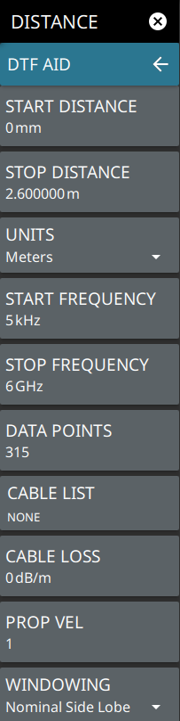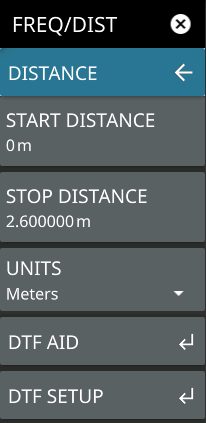 ![]() | START DISTANCE Enters a start distance value for the measurement. The start distance must be shorter than the stop distance. STOP DISTANCE Enters the stop distance for the measurement. The maximum stop distance is 1500 m (~4921 ft). Note that the maximum distance measurement (from start to stop) is dependent on frequency span and the number of sweep points. UNITS Selects distance units of meters or feet. DTF AID Opens the DTF AID Menu, providing on-screen guidance and access to multiple measurement settings. Also displays current measurement setup information and maximum testing distance and resolution. DTF SETUP |