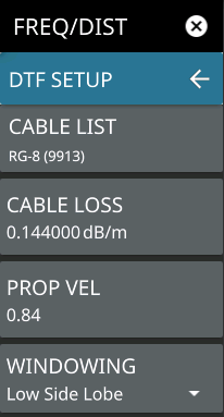 ![]() | CABLE LIST Opens a list of available cable specifications (see Cable List). When a cable is selected from this list, propagation velocity and cable loss are automatically set by the instrument. If the preselected values for propagation velocity or cable loss are changed, the analyzer will use “NONE” as the cable type. CABLE LOSS Manually enters a cable loss value. PROP VEL Manually enters a propagation velocity value. WINDOWING Selects the windowing for the measurement: • Rectangular: Rectangular windowing shows the highest side lobe levels (worst) and the greatest main lobe resolution (best). • Nominal Side Lobe: Nominal side lobe windowing shows less side lobe levels than rectangular windowing (good) but lower main lobe resolution (very good). • Low Side Lobe: Low side lobe windowing shows less side lobe levels than nominal windowing (very good) but lower main lobe resolution (good). • Minimum Side Lobe: Minimum side lobe windowing shows the lowest side lobe levels (best) but the least main lobe resolution (worst). |