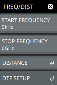 ![]() | Changing the start or the stop frequency requires turning off User Cal if the active Cal Type is Standard. Use Flex Cal to allow frequency range adjustments with User Cal on. Refer to . START FREQUENCY Sets the start frequency of the sweep range. Selecting the plus (+) or minus (–) control moves the start frequency in discrete steps. STOP FREQUENCY Sets the stop frequency of the sweep range. Selecting the plus (+) or minus (–) control moves the start frequency in discrete steps. DISTANCE Opens the DISTANCE Menu. DTF SETUP Opens the DTF SETUP Menu. |
