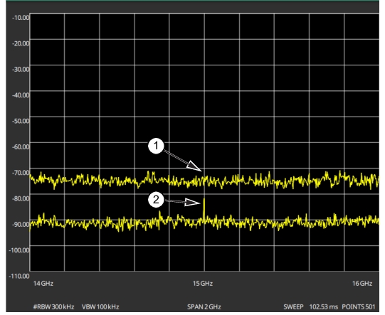 The preamplifier can be turned on and off by toggling PRE AMP via the status panel or the AMPLITUDE menu. Figure: 1. Preamplifier Off 2. Preamplifier On shows the noise floor with the preamplifier off (1) and on (2). Note that when the preamplifier is turned on, the noise floor drops significantly and a low-level signal is exposed. In order to use the preamplifier, the attenuation must be lower than 20 dB. If the preamplifier is turned on when the attenuation is greater than or equal to 20 dB, the attenuation will automatically drop to 10 dB. When AUTO ATTEN is toggled on, the REF LEVEL must be set to –40 dBm or lower to enable the preamplifier.