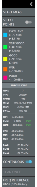 ![]() | START MEAS Initiates a coverage mapping measurement. A valid GPS antenna must be connected to the instrument and enabled for recording measurement data. Note that the START MEAS button is also included in the MEASURE Menu and provides the same functionality. SELECT POINTS Toggle this button to view the value and signal quality of the current measurement. Color-Coded Legend This legend shows the colors that are assigned for each power level threshold. Note that at the end of coverage mapping drive, the legend shows the percentage of breadcrumbs for each of the defined power levels. The power levels can be set using the COLOR SETUP Menu (Mapping). For example, if the power threshold value of the received signal is greater than or equal to -40 dBm, it is indicated in blue color (excellent). If the power value is less than -55 dBm it is indicated in pink color (poor). SELECTED POINT Displays the several parameters of the channel as follows: • CHANNEL: Displays the number of the selected channel. • TYPE: Displays the type of the selected channel • NAME: Displays the name of the selected/custom channel. • FREQUENCY: Displays the center frequency of the sweep range. • SPAN: Displays the sweep frequency range. • DWELL TIME: Displays the time duration spent scanning a given channel. Measurements will complete at the first opportunity greater than the specified time. A 0 µs or no value indicates the measurements complete as fast as possible. • CHANNEL POWER: Displays the channel power of the selected channel measured over the frequency range. • UPPER LIMIT: Displays the default maximum value of channel power. • LOWER LIMIT: Displays the default minimum value of channel power. • AVERAGE: Displays the average value of the total channel power measured over a given channel. • MINIMUM: Displays the minimum value of the channel power measured over a given channel. The black square indicates the color legend that represents the solid black line in the bar chart. • MAXIMUM: Displays the maximum value of the channel power measured over a given channel. The white square indicates the color legend that represents the solid white line in the bar chart. • ROLLING AVERAGE: Displays the rolling average of the channel power for the last 5 seconds of any given channel. • ROLLING MINIMUM: Displays the minimum rolling average value of the channel power for the last 5 seconds of any given channel. • ROLLING MAXIMUM: Displays the maximum rolling average value of the channel power for the last 5 seconds of any given channel. |