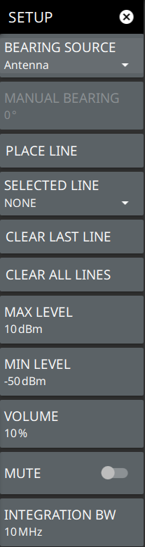 ![]() | BEARING SOURCE Selects the bearing source either as antenna or manual. If antenna is selected the electronic compass from the MA2700A InterferenceHunter is used to find the direction of the peak signal. If MANUAL is selected an external compass must be used to find the direction of the power signal. MANUAL BEARING Allows the user to manually enter the number of degrees from true north direction of the peak signal. In this case a magnetic compass or a compass App installed in a smart phone can be used to find the direction of the peak signal. Note that if an antenna that is less than 6 GHz range is used, then an external magnetic compass may be used to find the signal direction. The eCompass in MA2700A does not support in locating high frequency signals. Manual bearing feature is very useful when triangulating signals greater than 6 GHz, as the user is allowed to enter the bearing manually. PLACE LINE Places the bearing line data in red on the map, alternatively press the trigger on the MA2700A InterferenceHunter to place the red line on the map. SELECTED LINE Selects a desired bearing line of your choice. CLEAR ALL LINES Clears all the bearing line data from the map. MAX LEVEL Sets the upper level for the audio response of the measurement. This setting is useful for adjusting the resolution of the tone changes. Power levels above the MAX LEVEL will continue to emit sound an increasingly higher pitch. MIN LEVEL Sets the lower level for the audio response of the measurement. The MIN LEVEL also functions as a squelch. Power below this level will not emit a sound. VOLUME Adjusts the audio output volume. MUTE Mutes the instrument volume. INTEGRATION BW Sets the range of integration used in calculating the received power. The integration bandwidth is displayed as the shaded region between the bandwidth start and stop thresholds (dashed green lines). |