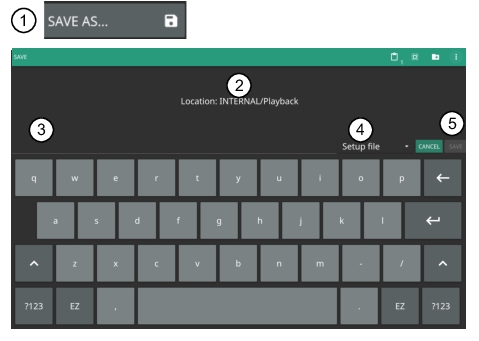 ![]() | QUICK SAVE saves a setup file immediately with the name shown in the button. The number in the name is incremented automatically so that the new name is ready for the next setup file to be saved. SAVE AS Opens the Save dialog to manually enter a file location, enter a file name, and to set the file type to be saved. Depending on the selected measurement, you can save the following: • Setup: Saves the current instrument setup (stp file type). • Trace: Saves the measurement point (trace) data and the current instrument setup (fmiart file type). • Trace CSV: Saves the visible trace point data in comma separated value format (csv file type). This format is useful for further analysis using other software tools. • Limit: Saves the current limit line point data (lim file type). • Screenshot: Saves a screenshot of the current measurement (png file type). • Trace + Screenshot: Saves both the current measurement and screenshot files (both fmiart and png file types). RECALL Opens the Recall File dialog to retrieve a file from a desired location. Only supported files will be displayed depending on the currently set measurement. When trace data is recalled, the instrument will change the settings to match the settings of the saved trace. The data will be recalled to the appropriate trace. That trace will be in a Hold mode. To exit the recalled data, simply change the trace mode back to Active. SAVE ON EVENT: Opens the SAVE ON EVENT Menu. This feature is not available in the 5GNR/LTE analyzer. BROWSE FILES Opens File Management. Refer to instrument user guide for detailed information. |