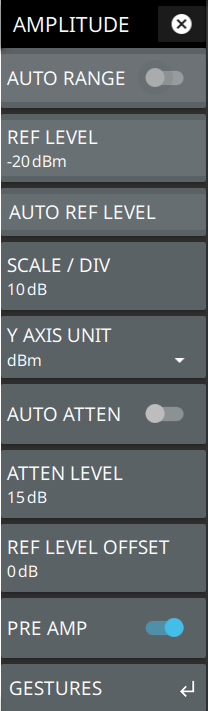 - ![]() | AUTO RANGE The instrument will dynamically update the attenuation and preamp settings for the measurement. Auto range helps ensure that harmonics and spurs are not introduced into the measurements. OFFSET REF LEVEL The reference level is the top graticule line on the measurement display. If the reference level offset is not zero, the offset reference level is displayed at this menu location. If auto range is enabled, the reference level is graphical only and will have no impact on attenuation or preamp. AUTO REF LEVEL Auto reference level will change the reference value so as to place the highest signal amplitude at about two graticule lines from the top. This feature is not available when auto range is enabled. SCALE/DIV The scale can be set from 1 dB per division to 15 dB per division. The default setting is 10 dB. Y AXIS UNIT Selects the y-axis amplitude units of dBm, dBW, or dBµV, etc. AUTO ATTEN Input attenuation can be either tied to the reference level (on) or manually selected (off). When input attenuation is tied to the reference level, attenuation is increased as higher reference levels are selected to make sure the instrument input circuits are not saturated by large signals that are likely to be present when high reference levels are required. Auto attenuation is not available when auto range is enabled. ATTEN LEVEL Manually sets the attenuation level. This feature is not available when auto range or auto attenuation is enabled. REF LEVEL OFFSET Reference level offset compensates for the presence of external input attenuation or gain. The default offset value is 0 dB. The reference level on the Y-axis will reflect the new offset value. For example, if the reference level was 0 dBm and an offset value of –10 dB is applied, the offset reference level will be 10 dBm. PRE AMP Turns the low-noise front-end preamplifier on or off. To ensure accurate measurement results, the largest signal into the instrument input when the preamplifier is turned on should be less than –40 dBm. The preamplifier cannot be turned on if auto attenuation is on and reference level is above –40 dBm. GESTURES Opens the GESTURES Menu. Not shown in LTE Modulation measurements. |