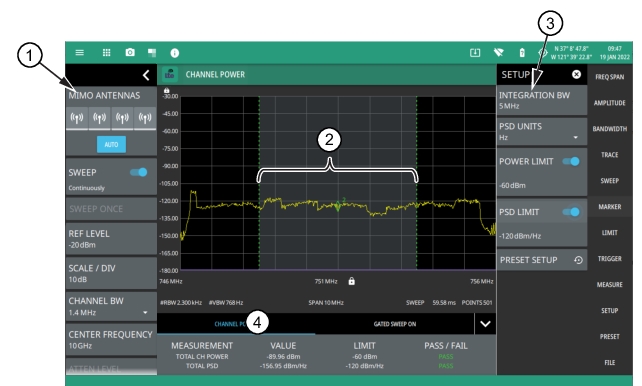 1. LTE Analyzer Status Panel: Each measurement features a unique status panel that displays settings and information relevant to the current measurement and view settings. This panel provides quick access to the MIMO antenna selection and status, sweep setting, and frequency and bandwidth configuration. See Status Panel (LTE Channel Power). 2. Channel Power: Channel power is integrated over the shaded region where the dashed green lines indicate the upper and lower frequency thresholds. 3. SETUP Menu: The channel power settings are configured in the SETUP menu. See SETUP Menu (LTE Channel Power). 4. Channel Power Summary: This area shows the channel power measurement summary data and pass/fail test results, when enabled: • The total channel power value and the test limit are expressed in dBm with a pass/fail result. • The total PSD limit is expressed in dBm with a pass/fail result. • Tapping this summary area opens the setup menu. |