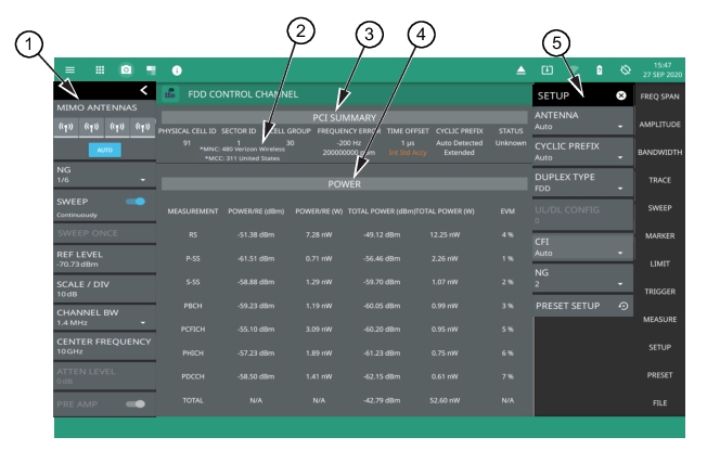 1. LTE Analyzer Status Panel: Each measurement features a unique status panel that displays settings and information relevant to the current measurement and view settings. This panel provides quick access to the MIMO antenna selection and status, NG parameter, sweep setting, and channel bandwidth configuration. See Status Panel (LTE Control Channel). 2. MNC/MCC Info: This area shows the Mobile Network Code (MNC) and Mobile Country Code (MCC) codes along with the carrier and the country name. Touch this info to open SIB MEASUREMENT dialog. Note that the asterisk symbol on this information indicates the presence of LAST SIB DECODE info as shown in Figure: LTE SIB MEASUREMENT and LAST SIB DECODE. Refer to SIB Measurement for detailed information. 3. PCI SUMMARY: This area shows the physical cell ID, including the sector ID, cell group number, frequency error, time offset, cyclic prefix, and sync status. Sync status can indicate if there is a PSS or SSS failure, a Full Sync, or an Unknown condition. Also noted is the instrument’s reference clock accuracy of Internal, External, or GNSS (GPS) high accuracy (requires GPS). 4. POWER: Shows power levels in dBm and watts of each physical layer control: • Reference Signal (RS) Power: The reference signal is used for downlink channel estimation. • Primary Synchronization Signal (P-SS) Power. The primary sync signal is used to obtain slot synchronization. It contains information needed for cell search. • Secondary Synchronization Signal (S-SS) Power: The secondary sync signal is used to obtain frame synchronization and cell identity. It contains information needed for cell search. • Physical Broadcast Channel (PBCH) Power: This physical channel carries system information for user equipment (UE) requiring access to the network. • Physical Control Format Indicator Channel (PCFICH) Power: This channel provides information to enable the UE to decode the PDCCH and PDSCH channels. • Physical Hybrid Automatic Repeat Request Indicator Channel (PHICH): Transmits the channel coded HARQ indicator codeword used for error correction. • Physical Downlink Control Channel (PDCCH): Physical channel that carries downlink control information (DCI) such as scheduling assignments and other control information. • TOTAL: Displays total POWER/RE (power per resource element) and POWER in dBm and watts. The total power for a signal is calculated as the product of the EPRE (Energy per Resource Element) for the signal and the number of REs in one unit (sub-frame, half-frame, or frame) depending on periodicity of the signal in the frame (signal present in every sub-frame, half-frame, or frame), averaged over the number of symbols in the same unit over which REs are counted. Total EVM is not calculated. 5. SETUP Menu: The control channel measurement settings are configured in the SETUP menu. See SETUP Menu (LTE Control Channel). |