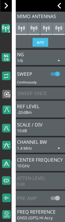 ![]() | MIMO ANTENNAS: Toggles the current MIMO antenna setting between AUTO or to select one of the available antennas. When a single antenna is selected, a blue underscore will appear below the antenna icon. The antenna icon is highlighted green when receiving a signal. NG: Selects the NG parameter of 1/6, 1/2, 1, or 2. NG is a parameter that determines the number of PHICH (Physical Hybrid ARQ Indicator Channel) groups in an LTE sub-frame (this number is constant for all sub-frames). SWEEP: Toggles the current sweep setting between continuously or sweep once. SWEEP ONCE When sweep is set to single sweep, SWEEP ONCE updates the measurement display. Data continues to be captured in the background. REF LEVEL Sets the reference level of the top graticule line in the selected units. If the reference level offset is not zero, OFFSET REF LEVEL is displayed at this location. Refer to Setting Amplitude. SCALE/DIV Sets the graticule scale/division for log-based units. This setting does not apply to linear units. CHANNEL BW Sets the measurement channel bandwidth. The available bandwidth settings depend on the selected band and bandwidth option installed in the instrument. CENTER FREQUENCY Sets the center frequency of the measurement channel. ATTEN LEVEL When auto attenuation is off, sets input attenuation. PRE AMP Toggles the low-noise front-end preamplifier on or off. Refer to Setting Amplitude. FREQ REFERENCE Indicates the current frequency reference source of Internal, External, or GNSS (GPS) Hi Accuracy (requires GPS). The instrument automatically selects the frequency reference in the following order of priority: external, GNSS (GPS), then the internal time base. |
