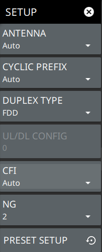 - ![]() | ANTENNA Sets the MIMO antenna number (0 to 3, or AUTO) to use during a measurement. AUTO will use the antenna with the highest received signal power. CYCLIC PREFIX Sets the cyclic prefix (or guard time interval) to Normal, Extended, or Auto. The cyclic prefix is a duplication of a fraction of the symbol end. This setting affects the OFDM symbol sensitivity to time dispersion. DUPLEX TYPE Selects either frequency division duplex (FDD) or time division duplex (TDD). UL/DL CONFIG Available only in TDD duplex type. Sets the uplink/downlink (UL/DL) configuration, or Frame Format. This selection determines which sub-frames are uplink sub-frames and which are downlink sub-frames, and where the transitions between uplink and downlink sub-frames occur. CFI Selects the control format indicator (CFI) which indicates how many OFDM symbols are used for carrying the control channel at each sub-frame. CFI1 uses the first symbol at the sub-frame for PDCCH allocation. CFI2 uses the first and the second symbol for PDCCH. CFI3 uses the first three symbols for PDCCH. NG: Selects the NG parameter of 1/6, 1/2, 1, or 2. NG is a parameter that determines the number of PHICH (Physical Hybrid ARQ Indicator Channel) groups in an LTE sub-frame (this number is constant for all sub-frames). PRESET SETUP Presets the SETUP menu to default settings. |