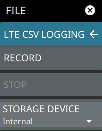 ![]() | RECORD Records the LTE measurement data and saves it as a CSV file. STOP Stops recording of the CSV logging of the LTE measurement data. STORAGE DEVICE Selects the storage device to store the LTE CSV file. |