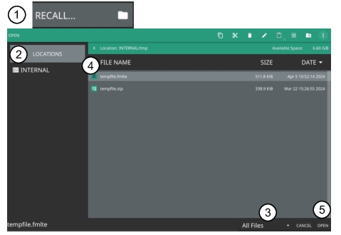![]() | QUICK SAVE saves a setup file immediately with the name shown in the button. The number in the name is incremented automatically so that the new name is ready for the next setup file to be saved. SAVE AS Opens the Save dialog to manually enter a file location, enter a file name, and to set the file type to be saved. Depending on the selected measurement, you can save the following: • Setup: Saves the current instrument setup (stp file type). • Trace: Saves the measurement point (trace) data and the current instrument setup (fmlte and fmspa file type). • Trace CSV: Saves the visible trace point data in comma separated value format (csv file type). This format is useful for further analysis using other software tools. • Screenshot: Saves a screenshot of the current measurement (png file type). • Trace + Screenshot: Saves both the current measurement and screenshot files (both fmlte and png file types). • KML: Saves measurement data in Keyhole Markup Language format, including the instrument model number, installed options, sample data with GNSS (GPS) coordinates, if GNSS (GPS) Option 31 is installed. (Option 431, Coverage Mapping only (Outdoor Map)). Note that the saved data is cumulative of all data points on the map or measurements since the map points were last cleared. RECALL Opens the Recall File dialog to retrieve a file from a desired location. LTE CSV LOGGING Opens LTE CSV LOGGING Menu LTE CAPTURE Initiates a digitized LTE data capture at the selected bandwidth. LTE captures are saved to the internal storage space in the captures folder (bin file type). This feature is meant to help identify LTE signal characteristics during early development. CAPTURE SYNC FAIL Automatically initiates a digitized LTE data capture when synchronization fails. The setting can be configured to capture just a single event or repeat events. LTE captures are saved to the internal storage space. BROWSE FILES Refer to “File Management” section of Instrument Overview chapter of the user guide. |
