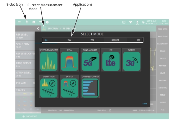 The instrument applications are selected from the 9-dot icon or the current measurement icon. To select an application, press the 9-dot icon in the title bar or the current measurement icon to display the available applications and the corresponding modes, illustrated in