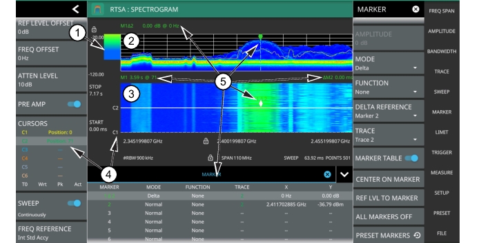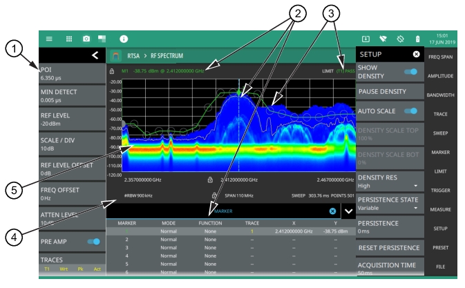 1. Status Panel: Each measurement features a unique status panel that displays settings and information relevant to the current measurement and view settings. 2. Markers: Markers are displayed as green diamonds on the trace to which they are assigned. The active marker is shown as a solid green diamond with a dashed vertical line. The marker amplitude and frequency will be displayed in green text on the top left edge of the display. In this example, a marker is shown at the signal peak with the marker table enabled. Double tap the marker to open a quick access peak search menu. 3. Limit Lines: Limit lines are shown as red (failing) or green (passing) lines with gray circles for each limit line point. Limit lines can be set up point-by-point or by using the envelope feature to quickly set a sloped or square envelope. The currently selected limit line point is shaded in gray. When limit lines are enabled, a pass/fail status is shown in the upper right of the window. If the trace crosses the limit, the trace color will turn red and the limit will indicate a failure. The limit is only applied to the active trace (see Setting Trace and Cursor Parameters), which is indicated next to the pass/fail. 4. Measurement Settings: The x-axis shows the start, center, and stop frequencies. The y-axis displays the amplitude of the graticule lines. RBW span, sweep time, and number of trace point settings are shown along the bottom of the spectrum display. If either resolution bandwidth or video bandwidth is set to manual, the “#” symbol will precede its label. If an offset frequency is entered, the offset value is displayed in the left side status panel. Pressing any of the editable parameters opens the keypad to edit the value directly. Information-only displays cannot be changed. 5. Multiple Trace Display: Each trace has a unique color and each can be set to Clear/Write, Average, Min or Max Hold, Rolling Average, Rolling Min or Max Hold, T1-T2 or T2-T1. Each trace can have Peak, Negative, Sample and Normal detectors. Traces can be set to Active, Hold/View, or Blank. |