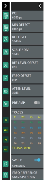 - ![]() | Pressing editable parameters opens the associated menu with a keypad that allows you to conveniently change the parameter value. These are the same settings found in the right side menus. POI Probability of Intercept (POI) is the minimum signal duration that the analyzer can detect at full amplitude with 100% probability. MIN DETECT The minimum detection is the minimum signal duration that the analyzer can detect. REF LEVEL Sets the reference level of the top graticule line. If the reference level offset is not zero, OFFSET REF LEVEL is displayed at this location. Refer to Setting Amplitude Parameters. SCALE/DIV Sets the graticule scale/division for log-based units. REF LEVEL OFFSET Compensates for the presence of external input attenuation or gain. FREQ OFFSET Accounts for frequency conversions outside of the analyzer. Refer to Setting Frequency Parameters. ATTEN LEVEL When auto attenuation is off, sets input attenuation. PRE AMP Toggles the low-noise front-end preamplifier on or off. Refer to Setting Amplitude Parameters. TRACES/CURSORS Displays the current status of up to six traces or cursors in a quick-view summary. When the measurement view is set to RF Spectrum, trace information is displayed in this area. When the measurement view is set to Spectrogram, cursor information is displayed in this area. Cursors are only available in the RTSA measurement with the Spectrogram view selected. The summary information includes the trace or cursor number, type, mode, and detector type. The active trace will show a highlighted background with the mode and detector type restated under the table. In Spectrogram, a reference trace (T0) will show you the settings of the trace used to fill the spectrogram. The reference trace settings are applied to all traces and cursors while in Spectrogram view. Pressing a trace or cursor in the summary panel activates the pressed trace or cursor and opens the TRACE menu. It allows you to select and set up an individual trace or cursor as desired. Refer to Setting Trace and Cursor Parameters. SWEEP Toggles the current sweep setting between continuously or sweep once. Refer to Setting Sweep Parameters. FREQ REFERENCE Indicates the current frequency reference source of Internal High Accuracy (used after GPS has lost sync, but while the internal clock still has good GPS reference), Internal Standard Accuracy, External, or GNSS (GPS) Hi Accuracy (requires GPS). The instrument automatically selects the frequency reference in the following order of priority: external, GPS, then the internal time base. |
