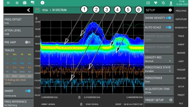 1. Color Bar settings are used to adjust the colors displayed at different amplitude levels. The color bar shown here represents the range of colors that will be displayed. This bar can be dragged up or down to adjust the coverage area. If signals or noise is outside of the color bar range, then black is displayed. The color bar top and bottom setting, and the overall hue to the color range is set via the SETUP Menu. 2. The traces shown in Spectrogram view are updated when the data in the spectrogram lands on the associated cursor. The traces show sweep data from that respective point in time. The bandwidth and amplitude settings in the example above were changed. Traces 1 through 3 reflect the changed settings while traces 4 through 6 are showing sweep data from earlier points in time. To freeze the spectrogram, stop the instrument from sweeping by toggling off Sweep Continuously. 3. The spectrogram START and STOP times shown here represent the full duration of all 142 sweeps shown in the spectrogram window. Cursors 1 through 6 are positioned throughout the spectrogram and can be dragged or set to a new time or position using the TRACE CURSOR Menu. Cursors can also be selected via the left side status menu CURSORS table. The bottom of the table shows the reference trace (T0) and its settings. The reference trace setting apply to all traces shown in the spectrum display. |