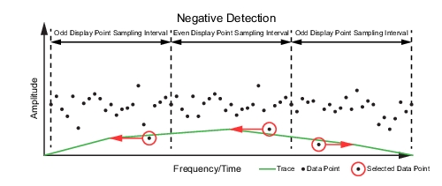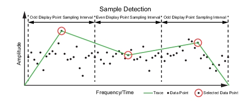 ![]() | TYPE Selects one of the following types of traces: • Clear/Write: Clears the trace after each sweep is complete and writes a new trace. • Min Hold: Represents the minimum value since sweeping began. The number of sweeps is displayed in the status panel TRACES table. • Max Hold: Represents the maximum value since sweeping began. The number of sweeps is displayed in the status panel TRACES table. • Average: The exponential average of all N traces, where N is the AVERAGES number set below. The number of sweeps is displayed in the status panel TRACES table. • Rolling Max Hold: Is the maximum rolling average value of the last N traces, where N is the AVERAGES number set below. The number of sweeps is displayed in the status panel TRACES table. • Rolling Min Hold: Is the minimum value of the last N traces, where N is the AVERAGES number set below. The number of sweeps is displayed in the status panel TRACES table. • Rolling Average: Is the rolling average of the last N traces, where N is the AVERAGES number set below. The number of sweeps is displayed in the status panel TRACES table. DETECTOR TYPE Selects one of the available detector types. Several detection methods tailor the function of the instrument to meet specific measurement requirements. There are often more measurement points across the screen than display points. The various detection methods are different ways of showing each display point (see Trace Detector Types). • Peak: Shows the maximum amplitude of sampled data for each display point, assuring that a narrow peak is not missed. • Negative: Shows the minimum amplitude of sampled data for each display point. This method is also useful when measuring modulated signals to see if some frequencies are not being used. • Sample: Shows the transient amplitude of the center of sampled data for each display point. This method is useful when measuring low-level signals and noise measurements. • Normal: Normal detector type also referred to as Rosenfell, shows the random noise than positive peak and avoids the missed-signal problem of the Sample Mode. Should the signal both rise and fall within the bucket interval, then the algorithm classifies the signal as noise. An odd-numbered data point displays the maximum value encountered during its bucket. An even-numbered data point displays the minimum value encountered during its bucket. If the signal is NOT classified as noise (does NOT rise and fall) then Normal is equivalent to positive peak. |