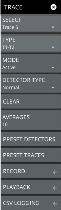 CLEAR Clears the currently active trace data. AVERAGES Sets the number of trace sweeps (N) to average. Available when the trace type is set to one of the averaging modes. PRESET TRACES Presets cursor and trace setup to Clear/Write, Active, with Peak Detector. CURSOR Opens the TRACE CURSOR Menu. RECORD Opens the TRACE RECORD Menu. PLAYBACK Opens the TRACE PLAYBACK Menu. CSV LOGGING Opens the TRACE CSV LOGGING Menu. |