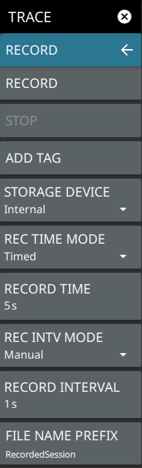 ![]() | RECORD Starts a recording session and saves trace and setup data to a CSV file (.csv). Files will be saved to the “PlaybackCsv” folder on the selected storage device (below). When recording is initiated, this button changes to PAUSE so you can temporarily stop the recording while leaving the recording session open. STOP Stops the active trace recording session. When pressed, a dialog will ask to either keep or discard the recording data. AUTO LOG Select one of the following automatic recording options (CSV recording will start automatically with Record or Playback selected – no need to press RECORD in the CSV menu. Manual CSV logging can be done independent of this setting.): • Record: Simultaneously saves CSV log data during a trace recording. • Playback: Simultaneously saves CSV log data during a recorded trace playback. • Off: No auto logging selected. STORAGE DEVICE Selects the target location for the trace logging. This will be to internal storage or to a connected external USB storage device.FILE NAME PREFIX Adds a custom file name prefix. The default prefix is “Traces” and will be appended with a date and time stamp, such as: “Traces_20201216T062419.135.csv.” |