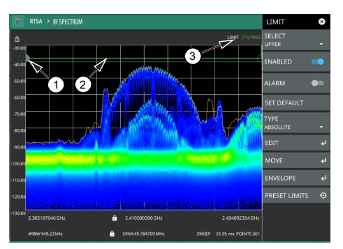 1. Limit points are shown as gray circles. The active point is filled in gray. Points can be dragged into position or set discretely using the frequency and amplitude settings in the LIMIT EDIT Menu. 2. The limit line shown here is an upper envelope limit line. The limit line color is green when the trace does not cross the limit line, and the limit line color turns red when the trace crosses it. 3. The limit test pass/fail status is also shown in green or red color at the top of the display. The limit test is applied to the active trace, indicated here by T1. |