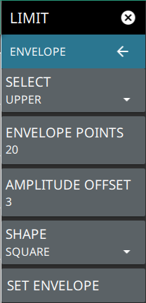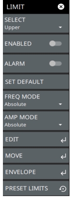 ![]() | SELECT: Selects UPPER or LOWER limit line for editing. ENABLED: Displays the selected limit when toggled on. ALARM: This setting is for toggling the alarm function on or off for the currently active limit line. When on, an alarm beep will occur when a data point exceeds the limit. Audio functionality will be added via an upcoming software update. SET DEFAULT: Pressing this button deletes all limit points for the currently active limit line and sets the default limit line value, which is a single limit whose position is 2.5 grid lines from the top of the screen (for the upper limit line) or 2.5 grid lines from the bottom of the screen (for the lower limit line), depending upon which limit is active. The inactive limit line is not altered. FREQ MODE: Sets frequency mode of the selected limit line as absolute or relative. This selection may be used at any time while working with limit lines. Absolute limit lines set the limit inflection points based upon the entered frequencies for each point. Relative limit lines set the limit inflection points relative to the current center frequency. Regardless of how a limit line is set up, saved, or recalled, it can be changed between absolute and relative by pressing the desired state. AMP MODE: Sets amplitude mode of the selected limit line as absolute or relative. This selection may be used at any time while working with limit lines. Absolute limit lines set the limit inflection points based upon the entered frequencies for each point. Relative limit lines set the limit inflection points relative to the current center frequency. Regardless of how a limit line is set up, saved, or recalled, it can be changed between absolute and relative by pressing the desired state. EDIT: Opens the LIMIT EDIT Menu. MOVE: Opens the LIMIT MOVE Menu. ENVELOPE: Opens the LIMIT ENVELOPE Menu. PRESET LIMITS: Presets the limit lines to default values. |