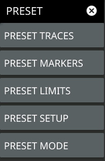 ![]() | PRESET TRACES Presets all trace settings to default values. PRESET MARKERS Presets all marker settings to default values. Turns off all markers. PRESET LIMITS Presets all values on the LIMIT menu to default values. Turns off all limit lines. PRESET SETUP Presets all values on the SETUP menu to default values. PRESET MODE Presets all of the current analyzer settings to default values. |