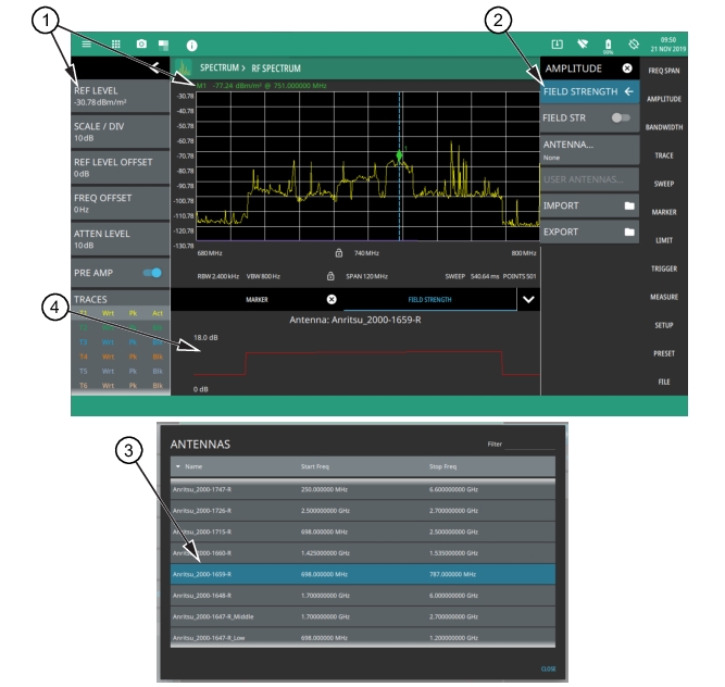 The field strength measurement is used in conjunction with an Anritsu antenna that has known antenna factors. Users can also import custom antenna factors for antennas not listed in the standard antenna selection list. When the field strength measurement is enabled, an additional plot is shown at the bottom of the display, indicating the selected antenna factor over the currently set frequency span. The field strength measurement is a measure of the RF power density that automatically compensates for the selected antenna factor. If an antenna is not selected, then the antenna gain is assumed to be 0 dB over the entire measurement range and the measurement can be manually compensated for using the Antenna Calculations, or to otherwise convert from one unit of measure to another.
