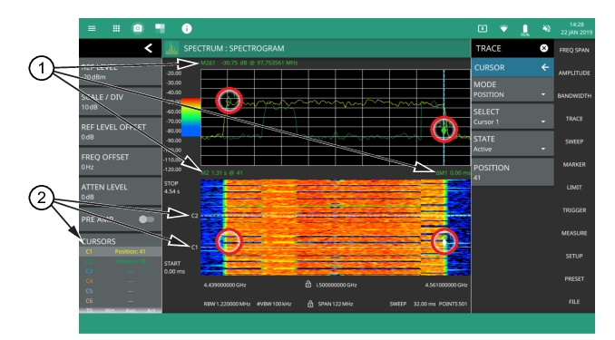 1. Markers: Displays the selected marker value. Marker values at the top of the spectrum display will show the current frequency and amplitude values of the active marker and its type. In this case, marker 2 is set to a delta marker relative to Marker 1. Marker values at the top of the spectrogram window show the current time or position of the active marker (left) and other marker information such as delta time (right). In this case, marker 2 is active and is at position 41 and has a relative time delta of 0 ms. Note that you can set a marker on any cursor to measure relative time differences between signal events as well as frequency and amplitude differences. Markers displayed on traces and cursors (encircled in red) show as green diamonds with the active marker in white fill. 2. Cursors: Cursors are shown on the spectrogram as white dashed lines. The active cursor is a solid white line. Cursors can be directly selected and dragged to position on the display or set via the TRACE > CURSOR menu. Cursors and their settings can also be accessed via the status panel. The start time is the most recent completed sweep and the beginning of the spectrogram. The stop time is the total time length of the spectrogram, essentially the amount of time it takes for a completed sweep to get from the bottom to the top of the spectrogram diagram with the current settings. |