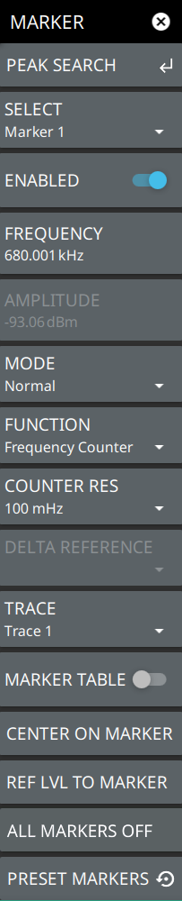 ![]() | PEAK SEARCH Opens the MARKER PEAK SEARCH. SELECT Turns on the selected marker if it is off or makes it the active marker if it is already turned on. Selecting the MARKER menu button for the first time will turn on Marker 1 as a normal marker at the center frequency, and open the MARKER menu. Selecting the MARKER menu button thereafter opens the MARKER menu to the current active marker, which is displayed in the upper left-hand corner of the screen. When a marker is turned on, it is a normal marker positioned at the center frequency of the selected trace. ENABLED: Enables the selected marker. When the toggle is off, the marker is disabled and not shown on the screen. FREQUENCY Displays the marker frequency. For delta markers, the frequency is relative to the reference marker. Change the marker frequency by dragging it to the desired location. You can also change the marker frequency by pressing the FREQUENCY button and changing it manually using the keypad controls. AMPLITUDE Displays the current marker amplitude. When the marker mode is set to Normal or Delta, the amplitude is set by the trace. In that case, the amplitude is not settable by the user. The button is grayed out, but the value is still updating with every sweep. If the marker is a Fixed marker, the amplitude value can be changed by dragging the marker to the desired location or by directly entering the amplitude using the keypad control. MODE Select marker preference: • Normal: A Normal marker is also known as a tracking marker. The frequency is fixed but the amplitude value varies from sweep to sweep. • Delta (Δ): A Delta (Δ) marker displays the delta frequency and amplitude between itself and a reference marker. If Marker 1 is selected to be a Delta marker, then Marker 2 is turned on as a reference marker for Marker 1 and it becomes a Normal marker at the same location. The reference marker can then be switched to a Fixed marker if desired. • Fixed: A Fixed marker has a fixed amplitude and fixed frequency, which are defined by the user and not related to the trace or sweep data. FUNCTION Sets the function of the currently selected marker to None, Noise, Frequency Counter, or Quasi-Peak. For more information about using marker functions, refer to Marker Functions. COUNTER RESOLUTION Available when the marker function is set to Frequency Counter. This setting adjusts the frequency counter marker resolution to 1 Hz, 100 mHz, 10 mHz, or 1 mHz. Lower resolutions will result in greater peak accuracy, but a slower sweep. |