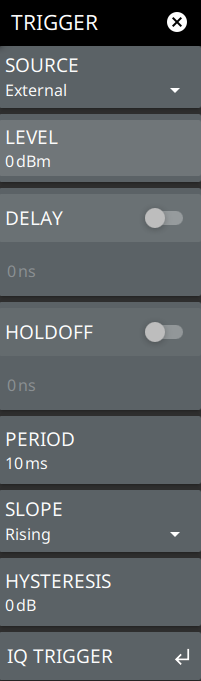 ![]() | SOURCE The SOURCE button offers several triggering options depending on which view mode the instrument is set: • GNSS/Internal: A new sweep will be triggered from internal timing source which will be synchronized to GNSS PPS if possible. • Free Run: A new sweep is started immediately upon completion of the current sweep. No trigger event is required to initiate a sweep. • Video: Available only in zero span. When enabled, the trigger level will be indicated graphically on the display with a horizontal VIDEO line. A new sweep is started when the input video level meets the value set via the LEVEL button. The level can also be adjusted by dragging the VIDEO line up or down. Video triggering is useful for monitoring a known frequency and its time transients, such as pulsed signal rise or fall times. • External 1 or 2: A TTL signal applied to the selected External Trigger SMA input connector causes a single sweep. After the sweep is complete, the resultant trace is continuously displayed until the next trigger signal is received. External 1 or 2 is supported only by MS2090A. MS2080A, MS2070A and MS2089A instruments support only External. LEVEL Used in zero span mode when the trigger source is set to Video. Sets the video trigger level threshold that initiates a sweep. The level crossing applies to rising or falling edges. Use the hysteresis setting below to adjust the sensitivity of the trigger level. DELAY Available only when the trigger source is set to External or Video. When toggled on, the delay value sets the amount of time that the analyzer waits to begin a measurement after a trigger signal is received. Negative trigger delay effectively moves the trace to the right so you can observe the activity before the trigger event. HOLDOFF Available only when the trigger source is set to External or Video. When toggled on, the analyzer waits the user defined amount of time to re-arm the trigger between trigger events. If a trigger event is received after the previous trigger, but before the holdoff time has elapsed, that trigger event will be ignored. PERIOD Used to set a periodic sweep trigger time. SLOPE Used when the trigger source is set to External or Video. Sets the trigger slope to rising or falling edge. HYSTERESIS Hysteresis is used to address noisy trigger signals. The hysteresis setting adjusts the sensitivity of the trigger system (the difference between the firing level and the arming level as shown in Figure: Trigger Levels and Hysteresis). A low hysteresis value sets the arming and firing levels close to each other, meaning a small signal change will cause a trigger. A large hysteresis value sets the arming and firing levels far apart, meaning a large signal change will be required to cause a trigger. IQ TRIGGER Opens IQ TRIGGER. |