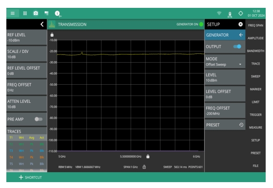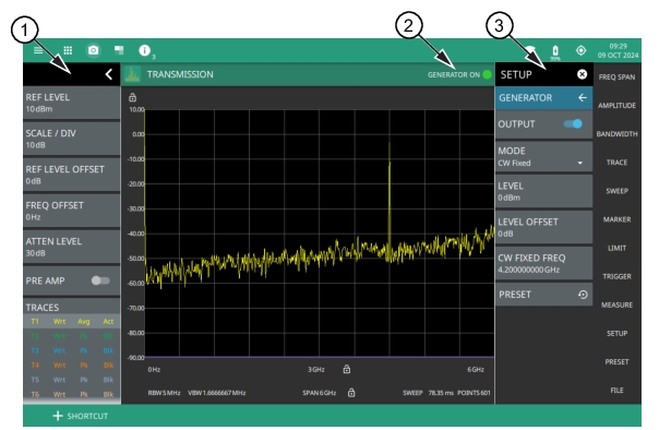 1. The status panel provides quick access to common spectrum analyzer settings. See STATUS PANEL (Transmission). 2. The GENERATOR ON appears on the top right, when the OUTPUT toggle is turned on. The green light indicates that the tracking generator or CW generator is on. 3. The setup menu is used to set transmission measurement parameters. See SETUP Menu (Transmission). Note that touching GENERATOR ON indicator will bring up the GENERATOR submenu. Refer to GENERATOR Menu (Option 20) for details. |